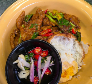 - พริกแกงใต้หมูราดข้าว เผ็ดร้อน “หรอยแรง” ใครชอบความจัดจ้านต้องจานนี้! “พริกแกงใต้หมูราดข้าว” ผัดพริกแกงสูตรปักษ์ใต้แท้ๆ ที่หอมกลิ่นขมิ้นและสมุนไพร รสชาติเผ็ดร้อนถึงใจ ผัดคลุกเคล้ากับเนื้อหมูจนเข้าเนื้อ โรยใบมะกรูดซอยเพิ่มความหอม ตักราดลงบนข้าวสวยร้อนๆ เหยาะน้ำปลาพริกนิดหน่อย รับรองว่าตาสว่าง หรอยจังฮู้แน่นอน