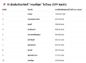 ตัวเลขนี้สะท้อนมูลค่าทางเศรษฐกิจที่แต่ละคนมีส่วนร่วมสร้างขึ้นในจังหวัดนั้นๆ ยิ่งสูงเท่าไหร่ ยิ่งแปลว่าคนในพื้นที่มีรายได้และกิจกรรมทางเศรษฐกิจมากขึ้นตามไปด้วย ลองมาดู 10 จังหวัดที่มีคนรวยที่สุดในไทย จากข้อมูลล่าสุดของสำนักงานสภาพัฒนาการเศรษฐกิจและสังคมแห่งชาติ (สศช.) ซึ่งอาจทำให้คุณประหลาดใจ