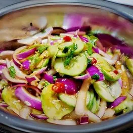 • เคล็ดลับ: คลุกแตงกวากับเกลือแล้วบีบน้ำออกเพื่อให้กรอบขึ้น ส่วนหอมหัวใหญ่ให้แช่น้ำเย็น 10 นาทีเพื่อลดความเผ็ดฉุน